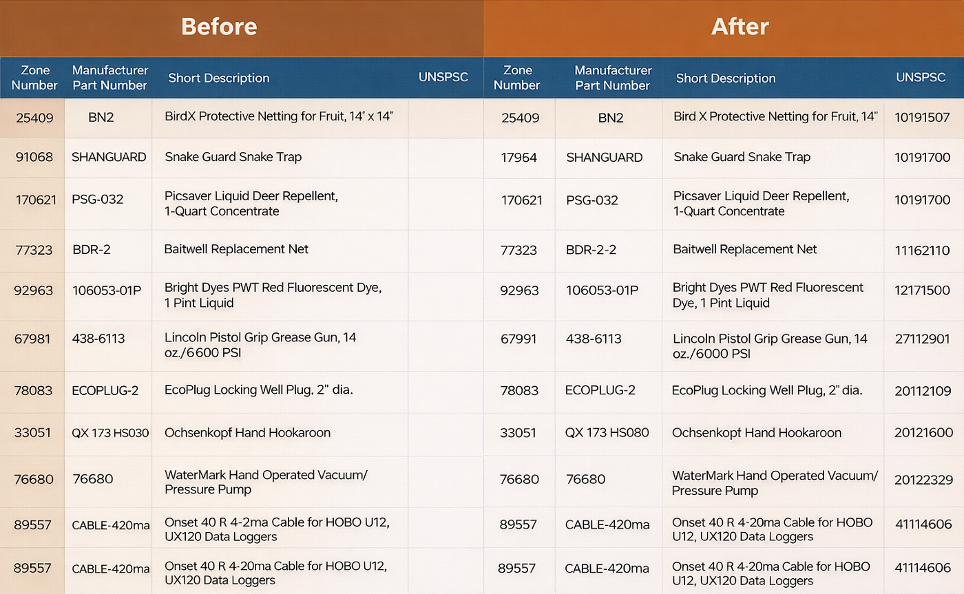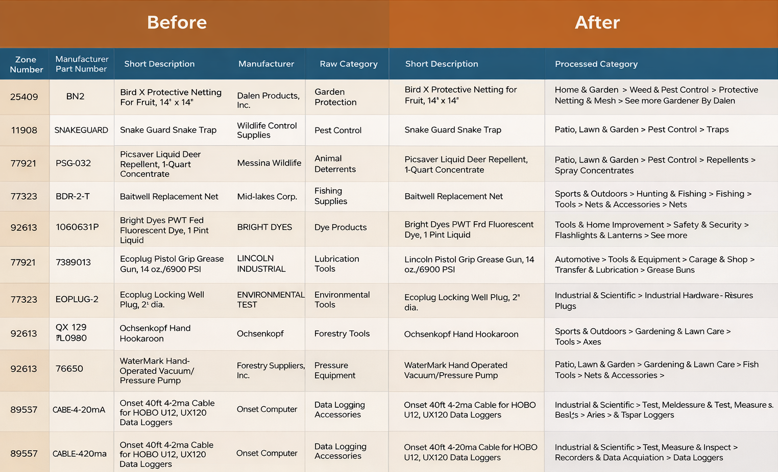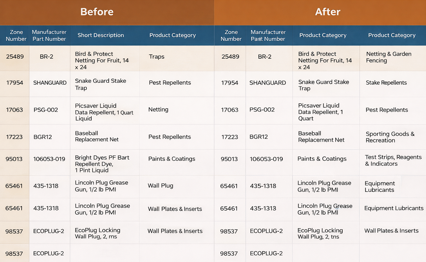 For SKUs with incomplete or poor-quality source data, our eCommerce product categorization process begins with an initial audit. We identify classification gaps, inconsistencies, and errors, and then standardize and enrich product data (attributes) by cross-referencing with authoritative sources, including manufacturer specifications, industry-standard databases, and competitor listings.